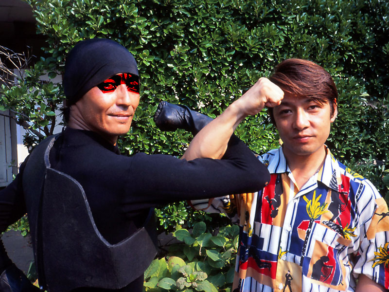 高野氏とは'01年に行川アイランドが閉園となる最後のイベントショーで共演し、それ以来のお付き合い。高野氏はゲストでバロム1のテーマで登場、白鳥健太郎として、自分の演じる悪ボスと1対1の殺陣を演じていただいた。それ以来、「磯・投げ情報」のグラビア記事に応援ゲストとして登場していただいたり、何かと仲良くしていただいている。