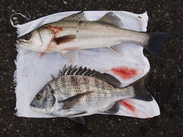 釣餌店の開店が午前6時45分。エサのカメジャコを買って、釣り場に着いたのは午前7時30分。仕掛けの支度やらなんやら済ませて7時45分にスタートフィッシング。 昇る朝日に一年の好釣を祈願して、第一投。アタリなし。あ……、あれ? まぁ、これは例年のこと。午前8時。三投目の竿先にクククッと微妙なアタリ。竿先を持ち込むのを待って、グィとアワセ。はい、今年一発目の釣果は30cmのセイゴでした。リリース。