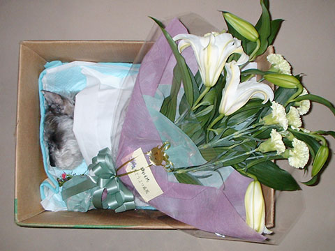 帰宅すると、家内が大泣きしながら玄関まで出てきた。立ち会えなかっただけに、余計にツライだろう。リビングにロンを安置し、二人でロンと過ごした日々の想い出を泣き語っていると、動物病院からお供えとして白百合と白いカーネーションの大きな花束が届いた。あぁ、本当に良い動物病院を選んだ。獣医師の先生、動物看護師のみなさんへの感謝で胸が一杯になった。ロンとの別れの悲しみが、動物病院のみなさんへの感謝で和らいだ。