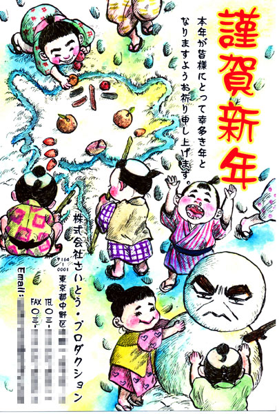 っとまぁ、そんなワケで毎年賀状を楽しみにしているのだが、さいとう・たかを先生の年賀状はオリジナルイラストが描かれており、さいとう先生のファンにとってはたまらない "作品" です。昨年は編み笠を被った牛の絵柄だったンだが、今年は寅の図柄で遊ぶ童だった。あ、雪だるまがゴルゴだ(笑)。