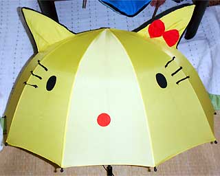 お仕事の納品で出掛けていたら、とんでもない雷雨に出くわしてしまい、車に積み込んでいた傘を差して客先に向かおうとしたんだが、いつも運転席のシートバックに差し込んである愛用の折りたたみ傘がない。どうやら先日、家内が使って積み込むのを忘れたようだ。外は稲妻が閃くやら、雷鳴が轟くやら、大粒の雨が叩き付けるように降っているやらで、傘無しでは出られない状況。約束の時間はもう間近。これは困った……。もしかして別の場所に傘を積みこんだかも知れないと、家内に電話をしてみると、「ラゲッジスペースの傘立てに黄色い傘が一本入ってるよ」 との返事。お~、助かった。そんじゃそれを差して……って、この傘?