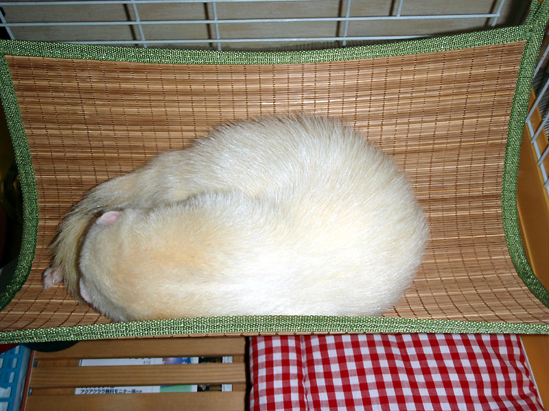 で、洗浄消毒を済ませた新しい夏用のハンモックを吊ってやったら、チャオは大喜びで乗っかり、スヤスヤとお昼寝。フェレットは好奇心旺盛なので、新しい物や環境にすぐに適応してくれる。まぁ、適応ってよりも、何でも遊び道具とか遊びの一環だと思っちゃうんだろう。そんな脳天気さが可愛い、ってのが "バ飼い主" の証なんだけどね、ってお話でした。