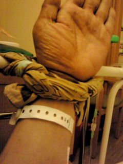 で、抗ガン剤治療中はベッド上で安静にして、動かないようにしていなければならないのだが、点滴針を刺した場所によっては、寝返りや腕の重みで薬液がきちんと投与できない場合がある。そこで、居眠りをしても腕が動かないように、ベッドの柵に手首を縛り付けて拘束しておいた。これなら無意識に点滴のルート(=管)が下敷きになってしまう事はないし、点滴針の刺さった部位が圧迫される事もない。