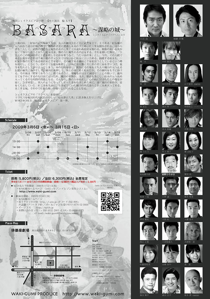 3月に俳優座劇場でシェークスピアの 「マクベス」 を背景にした、『BASARA~謀略の城~』という時代劇の公演がある。行川アイランドの閉鎖特別イベントで競演して以来、友達というか盟友というか、仲良くして貰っている俳優の髙野浩幸さん(舞台公演では高野ひろゆき)も出演する。昨日は第四幕の立ち稽古だったとか。
